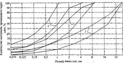 Рис. 7. Гранулометрические кривые для: 1 - сларри сил; 2 - ms; 3 - эмульсионно-щебенистой пористой смеси Второй способ проектирования состава литых смесей используется, главным образом, для смесей, содержащих эмульсии на твердых эмульгаторах - ЛЭМС. Предельные кривые по этому способу не используются. Состав смеси определяется расчетным путем, основываясь на назначении количества асфальтового вяжущего и коэффициентов содержания битума в пасте (эмульсия на твердых эмульгаторах). Затем также расчетным путем находят требуемое количество мелких а песчаных фракций. В случае необходимости в спроектированную песчаную ЛЭМС добавляют полученное расчетным путем количество щебеночных фракций [3]. Количество воды в жидкой смеси также определяется расчетом в зависимости от полной влагоемкости минерального порошка. В смесях, зерновой состав которых спроектирован по первому способу, количество воды обычно определяют методом лабораторного подбора. Для таких смесей рекомендуется содержание 6-8% воды, а для сларри сил 4-12%. При выборе вяжущего следует исходить из крупности, количества и природы минерального материала смеси: для кислых пород и щебенистых смесей следует применять катионные эмульсии на модифицированных битумах (например, для смеси типа ms за рубежом используется только такое вяжущее). Для каменных материалов из основных пород рекомендуется применение анионных эмульсий. Использование модифицированных битумов для таких материалов не всегда эффективно и поэтому необходима их проверка в лабораторных условиях или на опытном участке. Для литых ОМС предпочтительнее применять быстрораспадающиеся эмульсии, скорость распада которых регулируют с помощью специальных добавок. Обычно дозировка вяжущего в ЭМС составляет 3,5-9,5% от массы сухих материалов в пересчете на битум. Подбор минеральной части для связных ЭМС ведется по первому способу. В качестве вяжущего применяются медленно- или среднераспадающиеся эмульсии как прямые, так и обратные. Количество воды, используемой для увлажнения минеральных материалов, составляет ориентировочно 2-4% от массы сухих минеральных материалов и уточняется в лаборатории. 4.3. ПРОЕКТИРОВАНИЕ СОСТАВА ВЛАЖНЫХ СМЕСЕЙК этому классу смесей относятся ВОМС, нефтегравий и смеси на вспененном битуме. К смесям на вспененном битуме часто предъявляют те же требования, что и к асфальтобетонным [11], поэтому проектирование их состава ведут по аналогичной схеме. Для смесей типа ВОМС важное значение имеет рациональное соотношение минеральной части и органического вяжущего. Подбор состава для таких смесей целесообразно осуществлять по второму способу. Однако следует учитывать, что в этом случае расход вяжущего будет тем больше, чем выше его вязкость. Значит при использовании маловязкого вяжущего этот метод будет наиболее целесообразен. Суммарное количество воды и органического вяжущего в смеси определяют исходя из предпосылки, что поры смеси должны быть заполнены на 3/4 своего объема. Количество воды в ВОМС должно быть равным или несколько превышать количество вяжущего, но не более, чем на 20%. Обычно ориентировочное количество воды в смеси составляет 3-4%, а вяжущего - около 3,5%, если содержание мелкой фракции не превышает 10%. Подобранный расчетным путем состав смеси уточняют в лаборатории. При этом можно, вводя спе