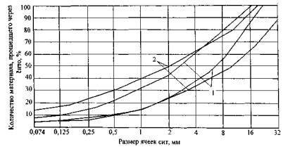 Рис. 8. Гранулометрические кривые для: 1 - нефтегравия; 2 - эмульсионно-гравийных плотных смесей Однако для плотных ЭМС используются эмульсии на вязких битумах, а для нефтегравия - крайне маловязкое органическое вяжущее со специальной добавкой, обеспечивающей водостойкость. Сочетание маловязкого вяжущего с принципом подбора минеральной части по предельным кривым дает очень неустойчивое равновесие системы - оптимальное количество вяжущего может сместиться в любую сторону под воздействием, например, незначительного колебания влажности материала или нарушения технологического режима приготовления смеси. При определении количества воды и вяжущего в нефтегравии рекомендуется руководствоваться «правилом числа 13», когда сумма содержания частиц размером меньше 0,071 мм, влажности минерального материала и количества вяжущего не должна превышать величину 13. Обычно содержание органического вяжущего в НГ не превышает 4%, а влажность минерального материала - менее 3%. Такое соотношение вода - вяжущее позволяет прогнозировать невысокие прочностные показатели смеси. Для повышения этих показателей в смеси предусмотрено содержание щебня размером зерен 5-25 мм в количестве более 60%. 4.4. ПРОЕКТИРОВАНИЕ СОСТАВА ГОРЯЧИХ СМЕСЕЙ ДЛЯ ТОНКИХ СЛОЕВПринцип проектирования состава минеральной смеси по предельным кривым характерен для смесей, используемых для тонких и сверхтонких слоев. Исключение составляет смесь БМО. Для смесей, применяемых в тонких слоях, возрастает значение прочности и шлифуемости дробленого материала (щебня и песка) и качества вяжущего. Наилучшим образом зарекомендовали себя битумные композиции, модифицированные вяжущие и смеси с добавками коротковолокнистого минерального материала. Количество вяжущего и волокнистого наполнителя подбирается опытным путем. Методы расчета предложены лишь для смесей БМО [16]. Проектирование составов БМО осуществляют в следующем порядке: • выбирают вид смеси и величину расхода битума в зависимости от условий движения, климатических условий и категории дороги; • определяют необходимую максимальную крупность щебня в зависимости от вида обрабатываемого покрытия; • назначают тип смеси по водостойкости в зависимости от плотности обрабатываемого покрытия; • рассчитывают состав заполняющей части по принципу расчета песчаных асфальтобетонных смесей или литой смеси [16], принимая содержание вяжущего в основном по верхней границе требований; • проверяют в лаборатории соответствие запроектированного состава и вносят необходимые коррективы; • зная пределы содержания щебня и величину расхода битума для выбранного вида смеси, рассчитывают количество битума, необходимое для обработки щебня, заполняющей и минеральной части смеси (щебня, песка, минерального порошка). В Германии для щебеночно-мастичных смесей требования к качеству применяемого вяжущего очень высокие, и поэтому не все битумные композиции и модифицированные битумы подходят для этих смесей [26]. Количество вяжущего назначается из расчета получения остаточной пористости в пределах 2-4% и обычно составляет около 9% [23]. За рубежом для всех смесей, применяемых для тонких и сверхтонких слоев, количество вяжущего чаще всего назначают, а затем уточняют опытным путем. Это вызывает неудобства в оценке качества материала при увеличива