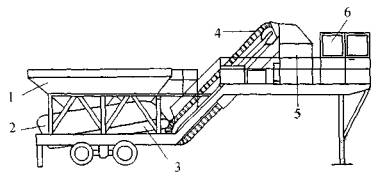 Рис. 9. Принципиальная схема современной нефтегравийной установки: 1 - бункер для каменных материалов; ленточные весы (дозатор); 3 - транспортер ленточный; 4 - ленточный конвейер; 5 - мешалка; 6 - пульт управления Следует отметить, что в обоих случаях пришли к выводу, что установки непрерывного действия для приготовления таких смесей гораздо менее эффективны и не позволяют получать смеси высокого качества из-за плохого перемешивания увлажненных материалов с органическим вяжущим. Качество материала, получаемого из ОМС, также зависит от правильной укладки и уплотнения его при устройстве слоев дорожной одежды. Обе смеси - ВОМС и нефтегравий - распределяются обычно при помощи укладчика и в редких случаях - автогрейдера. Предварительное уплотнение слоя производится виброплитой или трамбующим брусом, размещенным на асфальтоукладчике. Затем по установленному часто опытным путем режиму осуществляется укатка звеном катков. Однако предпочтение следует отдавать пневмокаткам. Окончательное доуплотнение происходит в результате движения транспортных средств. При приготовлении нефтегравия в период строительного сезона, когда температура каменных материалов падает до +10 - -5°С. предусматривается подача горячего вяжущего с температурой 80-100°С непосредственно на увлажненные холодные минеральные материалы, Если эти материалы переувлажнены, на них подается горячий пар. Основываясь на этом, можно сделать вывод, что нефтегравий разрешается готовить на минеральных материалах, взятых прямо из карьера, если их гранулометрический состав соответствует нормативам. Однако это не так - его необходимо высушивать и только после этого использовать [6]. Тем не менее подача горячего вяжущего на холодный увлажненный минеральный материал приводит к процессам, аналогичным при получении вспененного битума, особенно, если вместо воды подается пар. В этом случае обоснованы жесткие требования к процессу подачи органического вяжущего и воды в смеситель. Они должны вводиться одновременно по всей длине мешалки за очень короткое время, точность дозирования вяжущего составляет ±0,2%. Причем даже небольшое отклонение от этих требований вызывает значительное снижение качества смеси. В ВОМС соотношение количества мелких и крупных фракций обычно достаточно велико и не регламентировано так жестко, как для нефтегравия, поэтому точность дозирования вяжущего допускается ±1%, хотя система подачи воды и вяжущего в мешалку в соответствии с требованиями, предъявляемыми при получении нефтегравия. только повысит качество смеси. В настоящее время нельзя предъявить такие требования из-за их невыполнимости по причине неприспособленности для этих целей применяемого оборудования - по большей части это АБЗ с кустарным дооборудованием. Для влажных смесей - ВОМС и нефтегравий - при приготовлении очень важно быстрое перемешивание компонентов с органическим вяжущим, так как если скорость вращения вала мешалки недостаточна, то снижается качество перемешивания и наблюдается образование комков. Но если при нормальном дозировании воды и вяжущего эти комки могут не оказать заметного влияния на качество получаемой смеси, то даже незначительная передозировка воды приведет к резкому ухудшению ее качества, может наблюдаться налипание материала на лопасти и стенки мешалки и сни