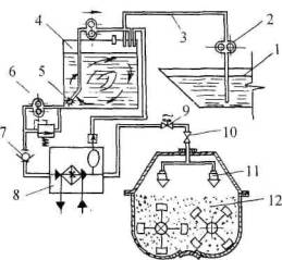 Рис. 10. Конструктивно-технологическая схема процесса подачи в мешалку смесителя обводненного битума во вспененном состоянии: 1 - приямок битумохранилища; 2 и 6- битумные насосы; 3 - битумопровод; 4 - смеситель битума; 5 - перемешивающий орган; 7- обратный клапан; 8 - нагреватель битума; 9 -регулирующий вентиль; 10- кран-задвижка; 11 - форсунка; 12 - смесительная камера Выбор системы вспенивания зависит от технологических условий, имеющихся на конкретных заводах. Количество воды или пара для вспенивания битума не превышает 1-2,5% от массы битума. Вспененный битум как можно быстрее должен быть введен в мешалку на возможно большую площадь минерального материала, т.е. «впрыснут» и диспергирован в процессе перемешивания смеси. Продолжительность перемешивания в этом случае сокращается на 15-20% по сравнению с перемешиванием асфальтобетонной смеси. Технология и режимы уплотнения таких смесей практически не отличаются от материалов из ОМС с использованием обычного битума. Схема приготовления ОМС на основе вспененных битумов в мобильных установках мало отличается от схемы приготовления связных ОМС. 5.4. МЕТОДЫ ПОЛУЧЕНИЯ И ПРИМЕНЕНИЯ ЛИТЫХ ЭМУЛЬСНОННО-МИНЕРАЛЬНЫХ СМЕСЕЙЛЭМС и сларри сил отличаются друг от друга, в основном, только типом эмульгатора. В технологическом плане получение этих смесей происходит при одних и тех же условиях. В 70-х годах литые смеси типа ЛЭМС широко применялись в России для устройства защитных и шероховатых слоев. Однако отсутствие оборудования для их приготовления и укладки быстро привело к забвению этих перспективных смесей. Причем такие смеси использовались и для закрепления щебня в слоях многощебенистых асфальтобетонов и поверхностной обработки. Вид закупорочного слоя, устроенного поверх поверхностной обработки, показан на рис. 11.