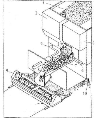 Рис. 12. Процесс устройства слоя ms: 1 - бункер для каменного материала; 2 - бункер для минерального порошка; 3 - дополнительный бункер; 4 - дозатор каменного материала; 5 - дозатор эмульсии; 6 - дозатор воды и добавок; 7 - лопасти смесителя; 8 - готовая смесь ms; 9 - распределительный короб; 10 - предварительное увлажнение покрытия