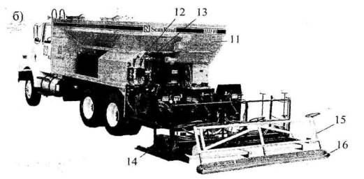 Рис. 13. Мобильная установка с распределительным коробом для получения смеси сларри сил: а - схема приготовления смеси; б - общий вид установки (фирма Akzo Nobel); 1 - каменный материал; 2 - бункер минерального порошка; 3 - отверстие для подачи каменного материала; 4 - вода; 5 - эмульсия; 6 - транспортер; 7- выход готовой смеси; 8 - смесь сларри сил; 9 - распределительный короб с устройством для регулировки толщины слоя; 10-мелкие дефекты обрабатываемого покрытия; 11 - бункера и дозаторы каменного материала и минерального порошка; 12 - регулятор подачи материалов; 13 - дозаторы для воды и жидких компонентов смеси; 14 - распределительный короб с уширителями; 15 - дополнительное выглаживающее устройство для грубозернистых смесей; 16 - лента-гладилка из жесткой резины 5.5. МЕТОДЫ ПОЛУЧЕНИЯ И ПРИМЕНЕНИЯ СМЕСЕЙ ДЛЯ ТОНКИХ СЛОЕВ НА ОСНОВЕ ВЯЗКОГО БИТУМАПрименение и укладка горячих тонких и сверхтонких слоев, в том числе из смесей ЩМА и БМО, производится на обычном оборудовании, предназначенном для приготовления и укладки асфальтобетона. Режимы уплотнения этих слоев имеют свою специфику, связанную с тем, что уплотняющие механизмы не должны раздавливать щебень при укатке. Режимы разработаны для каждого из этих слоев и описаны в соответствующих нормативных документах. Для эффективной работы слоев необходимо надежное их сцепление с нижележащим слоем покрытия, которое может достигаться путем подгрунтовки катионными эмульсиями или нефтяными, желательно, модифицированными битумами. В отдельных случаях возможно нанесение поверх щебеночного слоя закупорочных слоев из смесей сларри сил или ЛЭМС. При проведении работ по подгрунтовке поверхности дороги перед укладкой сверхтонких и тонких слоев, в том числе и из смесей БМО, особое внимание следует уделить равномерному распределению вяжущего по обрабатываемой поверхности. Для этого необходимо хорошо отрегулировать систему розлива вяжущего. Правильно отрегулированный угол установки распределительных сопл гудронатора для равномерного перекрытия струй рекомендован в пределах 15-20° к оси трубы (рис. 14). При этом расход вяжущего будет зависеть от высоты установки трубы гудронатора над поверхностью покрытия (рис. 15) [4].