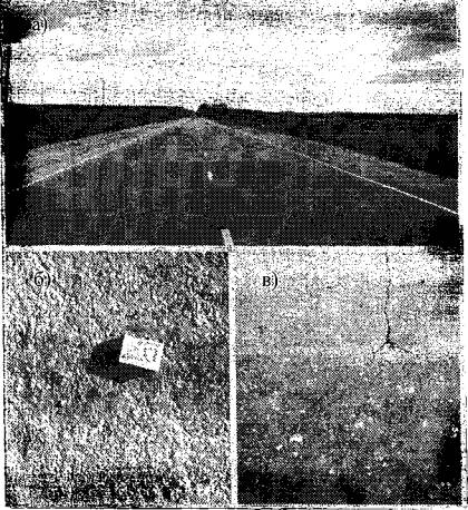 Рис. 21. Участок дороги III категории из ВОМС толщиной 3,5 см во II дорожно-климатической зоне: а - общий вид на четвертый год эксплуатации; б - текстура поверхности слоя из ВОМС на четвертый год эксплуатации; в - текстура слоя из ВОМС на второй год эксплуатации (внизу), трещина на полосе покрытия из горячего мелкозернистого асфальтобетона, уложенного одновременно с покрытием из ВОМС (вверху) Наилучшими физико-механическими показателями обладает смесь, которая формируется при интенсивности движения более 2000 авт./сут. при наличии не менее 50% тяжелых грузовых автомобилей. В России строительство покрытий из ВОМС было начато в 1979 г. и к 1989 г. было построено более 3 тыс. км дорог с таким покрытием в различных климатических и эксплуатационных условиях и на основе различных местных материалов. Для оценки состояния покрытий проводилось их регулярное обследование с отбором вырубок и определением физико-механических свойств материала. При правильном подборе состава смеси и соблюдении технологического регламента приготовления и применения смеси ни в одной дорожно-климатической зоне существенных дефектов или разрушений покрытий не наблюдалось. Было установлено, что материал из ВОМС с физико-механическими показателями, соответствующими требованиям ТУ 218 РСФСР 536-85 [9], обеспечивает нормальную эксплуатацию покрытий в I-V дорожно-климатических зонах в течение 5-7 лет, не требуя проведения ремонтных работ, а также выявлена хорошая работоспособность материала как в условиях повышенных температур (V дорожно-климатическая зона), так и резко континентального климата (I дорожно-климатическая зона). Отмечено, что остаточная пористость ВОМС снижается в процессе эксплуатации покрытия, т.е. плотность повышается и достигает максимального значения к 4-6 годам. В дальнейшем она практически не изменяется в течение 4-5 лет. Наблюдения за участками были прекращены после 8-10 лет их эксплуатации. К этому времени 56% покрытий из ВОМС еще находились в хорошем состоянии, на 34% начали появляться незначительные пластические деформации и около 10% требовали ремонта. Необходимо отметить, что слои из ВОМС обладают невысоким коэффициентом шероховатости, если не были применены дополнительные методы обработки поверхности или подбора специальных составов. Кроме того, в местах частых торможений, особенно если количество грузовых автомобилей в составе движения недостаточное, могут появляться пластические деформации. Однако для ремонта покрытий ВОМС является идеальным материалом. Эту смесь можно заготавливать впрок и хранить в штабелях. Она имеет хорошее сцепление с ОМС любого типа, а также с необработанным щебеночным покрытием. Более равномерному распределению смесей с заполнением всех неровностей и трещин ремонтируемого покрытия способствует увлажнение его поверхности. Под-грунтовка органическим вяжущим при этом исключается. Работы можно проводить до температуры воздуха -12°С, укладывать смеси на влажное, но не мокрое основание и при высокой влажности воздуха. При ремонте значительной площади покрытия необходимо учитывать, что толщина укладываемого слоя из ВОМС не должна быть менее 3,5 см. В Ростовской области, где ВОМС в большом количестве использовали для строительства выравнивающего слоя и текущего ремонта, в течение 2 лет было использовано более 45 тыс.т смеси. О