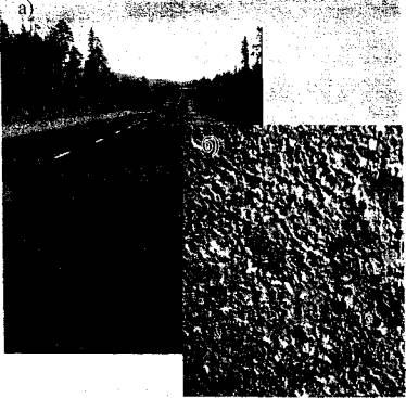 Рис. 22. Участок дороги с покрытием из черного щебня, обработанного обратной битумной эмульсией, после 7 лет эксплуатации в I дорожно-климатической зоне:а - общий вид; б - текстура поверхностиСрок службы таких покрытий в Мурманской области на федеральной дороге III категории без проведения текущего ремонта составляет в среднем около 10 лет. Интенсивность движения на этих участках около 2000 авт./сут., из них 30-35% составляют тяжелые грузовые автомобили. Водоустойчивость таких покрытий обычно составляет 0,95. Таким образом, применение обратных эмульсий для условий I дорожно-климатической зоны имеет существенные преимущества перед горячими ОМС. В 1996 г. были разработаны технические условия на применение черных щебеночных смесей для покрытий, в том числе и для I дорожно-климатической зоны [19]. ЗАКЛЮЧЕНИЕВ последнее время в большинстве стран, имеющих развитую сеть автомобильных дорог, все более насущной становится проблема их содержания и продления срока службы. В то же время условия их эксплуатации требуют устройства слоев износа с повышенной шероховатостью. Снижение финансирования дорожной отрасли практически во всех развитых странах не позволяет устраивать дорогостоящие асфальтобетонные слои толщиной 4-8 см. Поэтому большое внимание уделяется тонким и сверхтонким слоям покрытия из различных органоминеральных материалов как на основе вязких и жидких битумов, битумных эмульсий, так и с применением других органических вяжущих - гудронов, смол, тяжелых нефтей и т.п. Эти слои обеспечивают увеличение срока службы дорожной одежды без проведения капитального ремонта и улучшение эксплуатационных характеристик покрытия с учетом изменяющихся условий движения. За рубежом разработан достаточно большой спектр материалов для подобных слоев. В некоторых странах появляются различные варианты смесей, учитывающих отдельные местные особенности и потребности пользователей. Аналогичные разработки имеются и в России, где на основе какого-либо зарубежного прототипа разрабатывалась смесь, свойства которой больше соответствовали специфическим условиям страны и различных ее регионов. Обилие видов предложенных и применяемых в разных странах материалов потребовало проведения сравнительного анализа свойств, методов проектирования состава и технологических приемов их получения. Актуальность такого анализа возрастает в связи с тем, что (многие зарубежные фирмы предлагают свой товар и механизмы для получения и укладки своих смесей. Часто за разными названиями предлагаемой продукции различных фирм скрыт один из вариантов одной и той же смеси. Анализ, представленный в данной обзорной информации, позволит дорожным организациям делать более обоснованный выбор материалов, соответствующих потребностям пользователя и имеющимся возможностям получения и применения различных смесей и их вариантов. Однако следует учитывать, что огромная территория России с большим количеством разнообразных местных материалов и условиями эксплуатации дорожных покрытий не позволяет пользоваться принятым в большинстве зарубежных стран методом оценки свойств конечной продукции в зависимости от регламентированного качества исходных материалов. В условиях нашей страны более целесообразен метод расчета состава материала с предъявлением требований к конечном