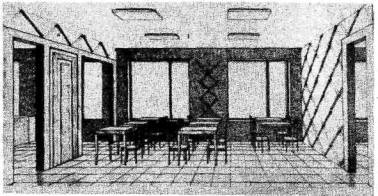 Рис. 8. Интерьер буфета АБЗ Дмитровского ДСК 2.117. Столовые следует проектировать во взаимосвязи с другими объектами общественного питания при данном производственном предприятии или группе предприятий, включая заготовочные предприятия для снабжения столовых продукцией общественного питания в соответствии с установленными для них норками проектирования. 2.118. Столовые рекомендуется размещать в надземных или цокольных этажах бытовых и административных зданий в виде встроенных или самостоятельных блоков, связанных с указанными зданиями непосредственно или через переход. В подвальных этажах допускается размещать складские и подсобные помещения столовых. К столовым следует предусматривать подъезды для автотранспорта с устройствами для погрузо-разгрузочных работ, а также входами для персонала столовых. Залы для посетителей располагаются обычно в одном уровне с производственными помещениями столовых. Расстояние от рабочих мест обслуживаемого персонала предприятий до столовых, как правило, не должно превышать 300 м. 2.119. Столовые должны включать: залы для посетителей и другие, связанные с ними помещения и устройства для обслуживания посетителей, проектируемые в соответствии со СНиП 2.09.04-87; производственные помещения и связанные с ними помещения для приема и хранения продуктов, а также служебные помещения, проектируемые в соответствии с нормами проектирования предприятий общественного питания. 2.120. Для посетителей, приходящих в уличной одежда, при столовой должен предусматриваться вестибюль с гардеробной уличной одежды, количество мест в которой должно приниматься равным 120 % числа мест, предназначенных для посетителей, приходящих в уличной одежде. При залах для посетителей следует предусматривать: умывальные, уборные, площади для размещения кассовых аппаратов или других расчетных устройств, а при залах вместимостью 200 мест и более - бюро для дежурного администратора столовой. 2.121. Буфетные стойки или торговые автоматы отпуска бесплатно выдаваемого молока в расфасованном виде следует предусматривать при столовых или помещениях для отдыха. Площадь для размещения этих устройств следует предусматривать из расчета 0,1 м2 на каждого получающего в течение смены молоко. Для хранения молока следует предусматривать при одной из столовых общезаводской распределитель с охлаждаемыми камерами. Площадь распределителя молока следует принимать из расчета - 0,015 м2 на каждого работающего списочного состава, получающего молоко. 2.122. Число мест в столовых следует принимать по количеству посетителей, обслуживаемых в течение обеденного периода наиболее многочисленной смены, и количества посадок, устанавливаемого в задании на проектирование в зависимости от организации труда обслуживаемых, но не более чем в 4 посадки. При неодновременном начале работы в смене число мест в столовой следует принимать по наиболее многочисленной части смены одновременно начинающей работу. Количество посадок в течение обеденного периода смены, указанное в настоящем пункте, допускается увеличивать. 2.123. Входы в залы вместимостью 100 чел. и более следует предусматривать через вестибюли, холлы (или расширенные участки коридоров), сообщающиеся с вестибюлями или с лестничными клетками, имеющими выход наружу непосредственно или через вестибюли. В холле