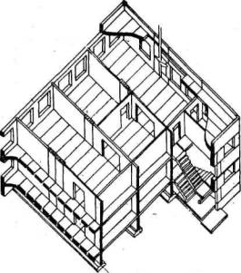 Рис. 5. Интерьер помещений цехового управления с высотой этажа 2,8 м Примечание. При высоте этажей 2,8 м площадь помещений может быть увеличена на 7 %. 2.16. Для обеспечения благоприятных условий микроклимата параметры воздушной среды вспомогательных помещений - температура и влажность воздуха, кратность воздухообмена и скорость движения воздуха - регламентируются СНиП II-33-75* "Отопление, вентиляция и кондиционирование воздуха" и СНиП 2.09.04-87 "Вспомогательные здания и помещения промышленных предприятий", в которых отражены специфические условия пользования указанными помещениями. 2.17. В теплый период года для обеспечения комфортных условий в помещениях рекомендуется использовать в первую очередь естественное проветривание помещений, солнцезащитные устройства, пропеллерные вентиляторы, бытовые увлажнители воздуха, бытовые кондиционеры, предусматривая механическую вентиляцию только при недостаточности указанных устройств. 2.18. Световой режим вспомогательных помещений регламентируется СНиП II-4-79 "Естественное и искусственное освещение" и СНиП 2.09.04-87, а также другими строительными нормами по проектированию помещений, располагаемых во вспомогательных зданиях. 2.19. Естественное освещение необходимо предусматривать в помещениях с постоянными рабочими местами (к ним относятся те, которые используются более 50 % рабочего времени смены - СН 245-71), для учебных занятий, читальных залов библиотек и архивов, перевязочных, приема больных, а также дежурного медицинского персонала здравпунктов, культурного обслуживания (за исключением залов собраний), в обеденных залах, а также в помещениях для отдыха при производственных помещениях. Остальные помещения могут не иметь естественного освещения или обеспечиваться им через остекление в перегородках, отделяющих их от помещений с естественным освещением. 2.20. Не следует завышать нормируемый уровень освещенности, поскольку чрезмерная инсоляция ухудшает самочувствие людей и снижает работоспособность. Рекомендуется избегать ориентации помещений с постоянными рабочими местами на сектор горизонта в пределах 200-280°, а при неизбежности такой ориентации - предусматривать солнцезащитные устройства на оконных проемах. 2.21. Солнцезащитные устройства (СЗУ) бывают регулируемые (внутренние, наружные и межстекольные) и нерегулируемые. Выбор типа СЗУ зависит от величины и продолжительности солнечной радиации, а также ориентации окон здания по сторонам горизонта с учетом режима пользования помещениями. В нерегулируемых ОЗУ, выполняемых в виде выступающих из плоскости наружных стен стационарных вертикальных или горизонтальных ребер или в виде кассет, образуемых указанными ребрами, расположение ребер на плоскости стены и их сечения определяются в зависимости от географической широты района строительства и ориентации помещений по сторонам горизонта. 2.22. В помещениях и постоянными рабочими местами, для учебных занятий, для приема больных в здравпунктах, для отдыха, в обеденных залах, залах собраний, совещаний и в читальных залах библиотек и архивов необходимо предусматривать защиту от шума. Звуковой режим помещений регламентирован СНиП II-12-77 "Защита от шума". 2.23. Целесообразное размещение и объемно-планировочное решение вспомогательных зданий может быть рекомендовано как эффективное мероприятие 