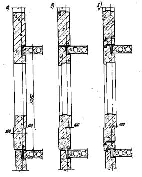 Рис. 15. Конструктивные решения деревянных окон 3.17. При заполнении проемов стеклопакетами повышается теплоизоляционная способность оконных блоков и индустриальность их изготовления. В стеклопакетах герметичное пространство между стеклами заполняют сухим, обеспыленным воздухом. 3.18. Для вспомогательных зданий в СССР применяют единую номенклатуру окон, размеры которых увязаны с размерами других ограждающих конструкций. Высота окон кратна 300 мм, от 600 до 2400 мм; ширина кратна 150 мм, от 600 до 1500 мм, а далее кратна от 300 до 3000 мм. Конструкции перегородок и полов3.19. Перегородки вспомогательных зданий должны быть индустриальными, обеспечивать высокие качества интерьера, возможность реконструкции, трансформации помещений. В современных вспомогательных зданиях для устройства перегородок применяют, как правило, крупноразмерные сборные элементы высотой на этаж. Панели перегородок толщиной 60 и 80 мм могут быть выполнены из легкого или тяжелого бетона или гипсобетона. Панели имеют конструктивное армирование, обеспечивающее восприятие монтажных нагрузок, и усиление конструкций в местах устройства проемов. Длина панелей сборных перегородок назначается в соответствии с планировочной структурой здания, расстояниями между вертикальными" несущими конструкциями и может достигать 6 м. 3.20. Перегородки устанавливают непосредственно на железобетонные плиты перекрытий. Перегородки по их верхним и боковым граням крепятся к примыкающим железобетонным конструкциям (плитам перекрытий, колоннам, стенам) с помощью специальных стальных крепежных элементов. Горизонтальный шов между верхней гранью перегородки и плитой перекрытия заполняют по месту конопаткой. Для отделки поверхностей крупноразмерных панелей перегородок применяют штукатурку, окраску, оклейку, облицовку плиткой в зависимости от качества поверхности панелей и требований, предъявляемых к интерьеру помещений. 3.21. Во вспомогательных зданиях применяют также облегченные перегородки каркасного типа. Каркас может быть деревянным или из специальных металлических профилей. Двухстороннюю обшивку каркаса выполняют из листовых материалов, чаще всего из гипсокартонных листов. Полость между листами обшивки может быть заполнена минеральной ватой или другим облегченным материалом, что позволяет значительно повысить звукоизолирующие качества перегородки. Крепление обшивки к карнизу обеспечивает их совместную работу при восприятии эксплуатационных и монтажных нагрузок. Каркасные перегородки выполняются сплошными, полистовой сборки или сборными из отдельных щитов. Высота щитов - на этаж. Сборные каркасные перегородки несколько тяжелее выполняемых по месту, так как каждый отдельный щит рассчитывается на монтажные нагрузки. Каркасные перегородки имеют гладкую поверхность, подготовленную для оклейки или окраски. Для обшивки перегородок могут быть применены специальные пластиковые листы, имеющие хорошую декоративную поверхность и не требующие дополнительной отделки. 3.22. При облицовке перегородок в душевых керамической плиткой на цементном растворе во избежание фильтрации влаги рекомендуется выполнять гидроизоляцию перегородок в местах возможного попадания на них воды на высоту не менее 1,5 м от пола. 3.23. Для разделения помещений культурного назначения, общественного питан