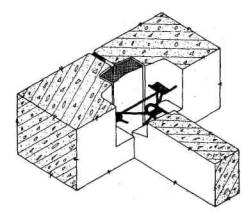 Рис. 13.Узел рядового сопряжения наружных панелей двухрядной и однорядной разрезки (аксонометрия) на основе серий жилых зданий 182-82 3.13. Для внутренних стен рекомендуется применять панели, которые имеют шпоночное рифление, что позволяет повысить жесткость вертикального стыка панелей, обеспечить хорошие звукоизоляционные качества. Стыки взаимно перпендикулярных внутренних стеновых панелей во вспомогательных зданиях выполняют с применением стальных связей. 3.14. Окна во вспомогательных зданиях должны обеспечивать необходимый уровень естественного освещения в помещениях с постоянными рабочими местами: цеховой администрации, в кабинетах врачей и др., а также в основных производственных помещениях и обеденных залах предприятий общественного питания. Во вспомогательных помещениях с временным пребыванием людей, в частности гардеробных, окна должны обеспечивать психологический контакт человека, находящегося в здании, с окружающей средой. В гардеробных помещениях вне зависимости от их глубины на участке стены шириной 6 м для связи с внешней средой, а также аэрации помещений достаточно разместить 2 окна шириной 1,2 м, высотой 0,9 м, что примерно в три раза меньше площади окон, примененных в большинстве действующих проектов. При полосовой двухрядной разрезке стен во всех вспомогательных помещениях, как правило, принимают единый размер оконного проема. 3.15. Основной светопрозрачный материал окон - листовое силикатное стекло. Для заполнения отдельных светопроемов, в частности, освещающих рассеянным светом подсобные и коммуникационные помещения, применяют стеклоблоки или профильное стекло. 3.16. В районах с температурой самой холодной пятидневки до минус 26 °С во вспомогательных зданиях выполняют окна с двойным остеклением в спаренных деревянных переплетах (Рис. 14). Для повышения долговечности, снижения массы и улучшения эстетических свойств оконных блоков применяют деревометаллические обрамления, включающие специальные профили из алюминиевых сплавов (Рис. 15).