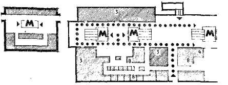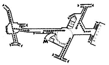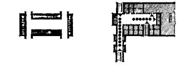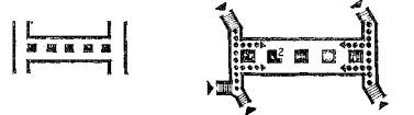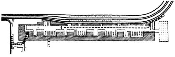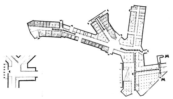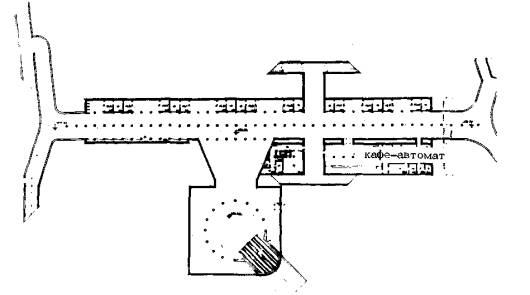 б) Предприятия и отдельные торговые залы многоэтажных зданий и центров торгово-бытового назначения, включенные в состав подземных торгово-пешеходных зон 7.15. Формирование комплексов предприятий и отдельных помещений в подземных уровнях торговых зданий и центров обусловлено общим архитектурно-пространственным построением многоэтажных зданий и комплексов, проведением четкого функционального вертикального зонирования в них. При этом требование национального размещения различных помещений и предприятий по этажам сочетается с необходимостью обеспечения компактности зданий и комплексов, организации удобных подходов покупателей и подъезда транспорта. Размещение торговых залов в подземном уровне является широко распространенным приемом, так как первый подземный этаж относительно близок к уровню земли и по удаленности от земли может быть приравнен ко второму (наземному), а это наравне с первым самый удобный этаж для покупателей. Но наиболее целесообразным можно считать размещение торговых залов в подземном уровне в тех случаях, когда возможна организация их непосредственной связи с подземными пешеходными зонами. 7.16. Внутри комплекса, крупного торгового центра может предусматриваться подземная замкнутая пешеходная зона (рис. 7), которая потенциально имеет возможность в будущем при проведении реконструктивных мероприятий быть связанной с системой подземных пешеходных зон. Эти пешеходные зоны формируют торгово-пешеходный пассаж или площадь в подземном уровне, дублирующие аналогичные пешеходные наземные зоны, не связанные с ними вертикальными связями. Из этой подземной пешеходной зоны организуются входы в подземные торговые залы (Нью-Йорк, торговый центр "Рузвельт-Филд"). ЗАМКНУТАЯ ПОДЗЕМНАЯ ТОРГОВО-ПЕШЕХОДНАЯ ЗОНА