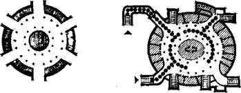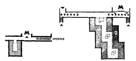 Рис. 4. Приемы архитектурно-пространственной организации комплексов обслуживания в составе подземных пешеходных зон на привокзальных площадях 1 - специализированные магазины; 2 - залы универмагов; 3 - кафе; рестораны; 4 - общественные туалеты. 7.11. В составе многоуровневых целиком подземных общественно-транспортных узлов возможны следующие приемы организации комплексов обслуживания (рис. 5): - расположение в первом подземном уровне, решенном как многофункциональный комплекс, в состав которого входят станции метро, транспортные магистрали и автостоянки, а также предприятия и учреждения культурно-бытового обслуживания (Париж, проект комплекса под садом Тюильри); РАЗМЕЩЕНИЕ ОБЪЕКТОВ В УРОВНЕ ПОДЗЕМНЫХ ВЕСТИБЮЛЕЙ СТАНЦИЙ МЕТРО