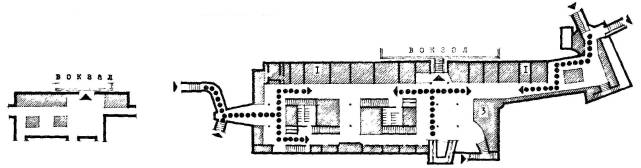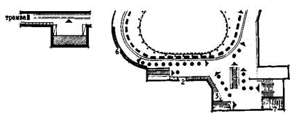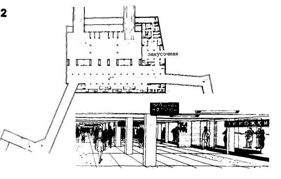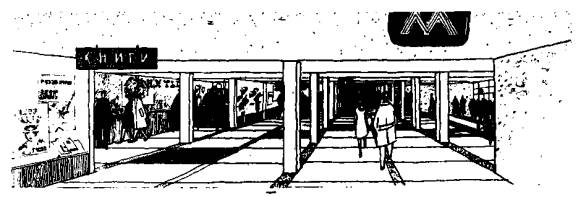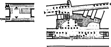 г. Белград, площадь Теразии 7.8. При пешеходных переходах сложных планировочных схем возможны следующие приемы пространственной организации предприятий обслуживания (рис. 2): - периметральное расположение киосков, микромагазинов и других объектов обслуживания (Белград, пл. Теразии: 6 киосков и 10 магазинов, а также подземный торговый зал рядом стоящего универмага): - островное расположение отдельных или сгруппированных предприятий при различной конфигурации плана основного сооружения (Катовице, пл. Рондо - в круглом зале, диаметром 48 м - круглый объем торговых предприятий: 3 киоска, 5 микромагазинов, кофейный бар; Прага, пл. Вацлавская; Киев, пл. Октябрьской революции); - сложные композиции, включающие периметральное и островное размещение предприятий обслуживания, с различной конфигурацией плана основного сооружения (Вена, пл. Оперы - в зале формы эллипса, размером 51×56 м: по периметру 19 микромагазинов, в центре - бар-экспресс и два ряда колонн, выделяющих зоны пешеходного движения и подхода покупателей к предприятиям обслуживания; Белград, пл. Теразии - в зале трапециевидной формы, размером 20×50 м: по периметру 12 микромагазинов, общественный туалет, в центре зала - кафе-бар и транспортное агентство; Белград, пл. Мишле Пьяде - аналогичное решение, но в центре - магазин типа супермаркета). В целом объемно-планировочные решения комплексов, расположенных при пешеходных переходах сложных схем, отличаются достаточно плотной застройкой объектов обслуживания. Площадь предприятий обслуживания в этих подземных сооружениях достигает 50% общей площади сооружения. Но несмотря на это во всех сооружениях обеспечивается четкое функциональное зонирование с выделением зоны беспрепятственного пешеходного движения, часто огражденной рядами колонн. 7.9. При вестибюлях станций метрополитена возможны следующие приемы организации комплексов обслуживания (рис. 3): - размещение комплексов обслуживания непосредственно в уровне перронных залов при мелком заложении транспортных коммуникаций (Вена, пл. Шоттентор - периметрально вдоль стен: 4 микромагазина, кафе-автомат, торговые автоматы длиной 35м, киоски, витрины, общественные туалеты; Вена, пл. Зюдтиролерплац - торговая зона расположена в стороне от входной части); при мелком заложении метро зона торгово-бытового обслуживания может быть расположена на перекрытии перронного зала, в той части сооружения, которая обычно засыпается землей до наземного уровня; - размещение в уровне вестибюля метро - либо в виде изолированной торговой зоны, либо зоны, примыкающей вплотную к вестибюльной группе помещений метро (проектное предложение по реконструкции пл. Леси Украинки в Киеве; Париж, станция "Дефанс" - торговая зона "метро-бутик" общей площадью 5000 м в составе 38 объектов: супермаркет - 850 м2, промтоварный магазин - 1338 м2, специализированный магазин "Все для вязания" - 1179 м2, кафе, "фотография", парикмахерская, срочный ремонт обуви, банк, почта и др.). РАЗМЕЩЕНИЕ ОБЪЕКТОВ В УРОВНЕ ПЕРОЖЫХ ЗАЛОВ ПРИ МЕЛКОМ ЗАЛОЖЕНИИ ЛИНИИ ТРАНСПОРТА