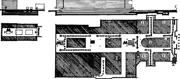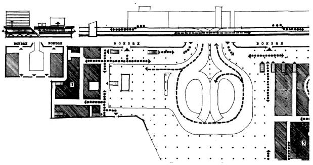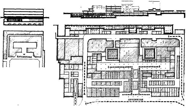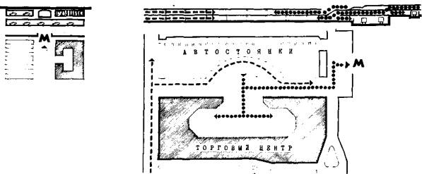 г. Хельсинки, площадь Центрального вокзала (проект) Рис. 6. Приемы архитектурно-пространственной организации комплексов обслуживания в составе многофункциональных центров при реконструкции привокзальных районов 1 - магазины; 2 - кафе; 3 - торговый центр В Хельсинки подземная торгово-пешеходная площадь 245×105 м на одну треть находится под привокзальной площадью, остальная часть - в составе многоуровневого центра. Подземные пешеходные улицы связывают вокзал с остановками наземного транспорта, зданиями и улицами, расположенными вблизи. В Токио, в районе нескольких вокзалов площади Синдзюку подземная площадь решена как обширная зона, охватывающая всю территорию под привокзальной площадью, подземные этажи вокзалов и других зданий (в т.ч. делового центра), вестибюли станций метро. Ниже этого уровня организованы автостоянки. Торговый центр, входящий в состав подземного комплекса, имеет общую площадь 10000 м2. В целом объемно-планировочные решения комплексов торгово-бытового обслуживания, размещаемых при станциях метро, железнодорожных вокзалах и других транспортных узлах, отличаются разнообразием приемов компоновки этих сооружений, часто по составу напоминающих торговые центры. Площадь предприятий обслуживания в них бывает равна или превышает площадь зоны пешеходного движения (предприятия обслуживания занимают от 25 до 55% общей площади пешеходной зоны). 7.13. Для всех типов комплексов обслуживания, размещаемых при пешеходно-транспортных сооружениях, необходимо проведение принципа четкого функционального зонирования. При этом выделяются зоны беспрепятственного движения людей по кратчайшему пути между выходами из торговой зоны, располагающейся в стороне от проходов интенсивных потоков людей, в так называемых "свободных зонах", образующихся в центральных частях перехода зального типа, или в торцах и периметральных частях других видов переходов и зон. Во всех торгово-пешеходных подземных зонах особо выделяются незанятые предприятиями обслуживания площади перед входами в вестибюли станции метро и вокзалы, где концентрируются массы пассажиров. Оптимальным решением можно считать размещение торговых и транспортных зон в разных уровнях, удобно связанных по вертикали. 7.14. Очень важным аспектом объемно-планировочного решения торговых комплексов является организация группы помещений, связанных с загрузкой товаров. Основные приемы решения зоны загрузки, как показал опыт, могут быть сведены к следующему: - в тех сооружениях, где спуски для пешеходов решены пандусами, возможна транспортировка грузов малогабаритным транспортом с наземного уровня непосредственно в подземные загрузочные помещения; - в подземных одноуровневых сооружениях, где нет возможности подъезда транспорта в подземные помещения, товары с наземного уровня могут опускаться при помощи: либо лифтов, расположенных в рядом стоящих зданиях (как, например, в Париже, на привокзальной площади), либо открытых выжимных лифтов тротуарного типа, расположенных на площадках с возможностью подъезда грузовых машин (проектные предложения ЦНИИЭП торгово-бытовых зданий); либо грузовых лифтов для спуска малолитражных легковых автомобилей в подземный уровень (проектные предложения ЦНИИЭП торгово-бытовых зданий); - в подземных сооружениях, имеющих в одном уровне и торговые, и 