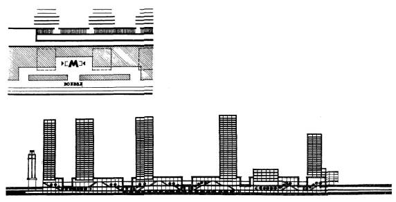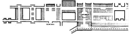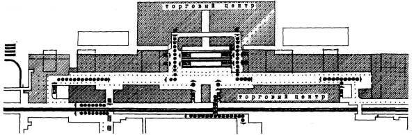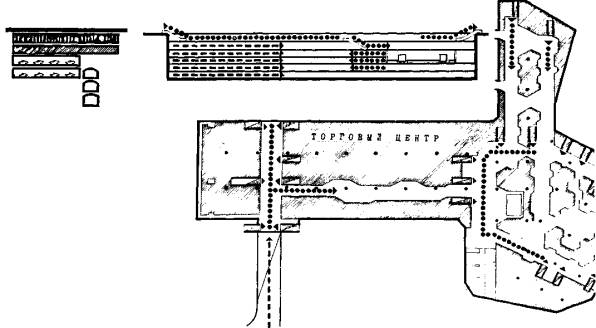 7.12. Наиболее сложные композиции общественно-торговых и транспортных зон возникает при комплексной реконструкции привокзального района, когда подземные пешеходные зоны становятся элементами многоуровневых и многофункциональных сооружений. Торговые комплексы, тяготеющие к ним, могут формироваться как из предприятий попутного обслуживания, так и из предприятий, входящих в состав торговых центров (рис. 6). РАЗМЕЩЕНИЕ КОМПЛЕКСА ОБСЛУЖИВАНИЯ ПОД ПРИВОКЗАЛЬНОЙ ПЛОЩАДЬЮ, В СОСТАВЕ МНОГОФУНКЦИАНАЛЬНОГО ЦЕНТРА