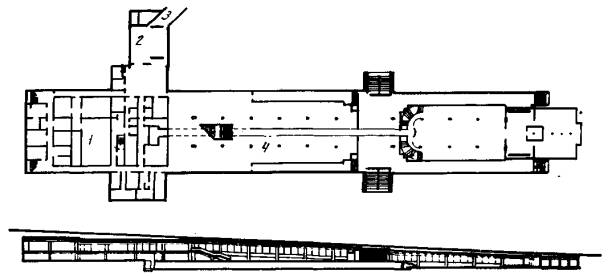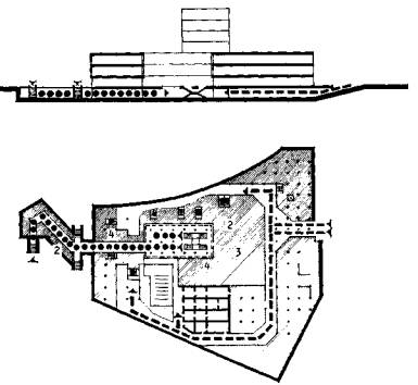 г. Сенри, общественно-торговый центр Рис. 8. Приемы архитектурно-пространственной организации подземных торгово-пешеходно-транспортных зон, включенных в состав общественно-торговых центров 1 - магазины; 2 - супермаркет; 3 - залы кафе, ресторанов; 4 - предприятия бытового обслуживания При включении вестибюля метро в подземный уровень торгового комплекса (Стокгольм, универмаг "Оленс") торгово-пешеходная зона является основной, так как транспортная зона фактически отсутствует. В тех случаях, когда транспортная зона ярко выражена, имеются или подъездные пути, или автобусная станция, эта зона становится настолько функционально значимой, что пешеходная зона становится уже связующей с торговыми предприятиями. В практике имеются примеры размещения в подземном уровне торговых центров: автовокзалов (Бирмингем, торговый центр "Булл-Ринг" и аналогичный комплекс в Скопле), остановок трамвая (Гетеборг, торговый центр "Фрелунда-Торг"), железнодорожных вокзалов (Токио, универмаг "Кейо"; Сенри, торговый центр). Подземная торгово-пешеходная и транспортная зоны в этих случаях могут размещаться в одном уровне при соблюдении четкого функционального зонирования (в гг. Скопле, Бирмингем) или же занимать разные уровни: торгово-пешеходная - в первом подземном, а транспортная - во втором (в г. Сенри). 7.19. Примыкание подземных этажей торговых зданий и комплексов к пешеходным переходам позволяет организовать входы в эти здания и комплексы с двух пешеходных уровней: наземного и подземного. Одновременно появляется возможность расширить свое влияние и в зону пешеходного перехода. Так, если подземный переход соединяет торговые здания, находящиеся с двух сторон улицы, это подземное пространство уже решается как элемент торгового комплекса (г. Тампере, универмаг "Войма" - в подземном переходе кафе со столиками непосредственно в зоне перехода). Если торговое здание имеет непосредственную связь с подземными автостоянками, расположенными на другой стороне улицы, через подземный переход, то он также используется покупателями и для входа в это здание из города сразу из подземного перехода, и для удобного прохода от автостоянок и обратно прямо из торгового зала с тележками непосредственно к автомобилям (Любляна, торговый центр "Максимаркет") Переход этот, насыщается мелкорозничной торговлей и другими объектами попутного обслуживания. Еще более сложную организацию имеют подземные пешеходные переходы, если они связывают крупное торговое здание с вестибюлем станции метро или железной дороги (Стокгольм, универмаг "ЭПА" Берлин, торговый центр "Ку-Дамм-ЭК"; Лондон, торговый центр Элефант-энд-Касл"). В этих случаях подземные торговые залы функционально сливаются с системой городских торгово-пешеходных зон, образуя как бы единое сооружение. В целом размещение части помещений и отдельных предприятии в подземных уровнях торговых зданий и центров, общественно-торговых центров позволяет приблизить торговые залы к системе подземных пешеходных переходов, к остановкам транспорта и автостоянкам. Как показывает практика, наиболее перспективными являются те типы зданий, в которых нашло отражение комплексное решение многих вопросов, связанных с рациональной организацией подхода и подъезда посетителей в наземном и подземном уровнях. Подземные пешеходные зоны, примыкающи