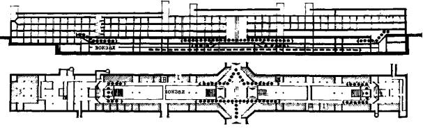 г. Париж, станция метро "Дефанс" - расположение в одном или двух верхних уровнях рядом с помещениями транспортного назначения при организации основных перонных залов в более низких уровнях (Франкфурт-на-Майне, пл. Хауптвахе; Мюнхен, пл. Карлсплац - весь верхний уровень шестиярусного подземного комплекса занимает торговый центр общей площадью 9000 м2 в составе 100 предприятий с длиной улиц 150 м, с 38 эскалаторами и 19 лестницами). КОМПЛЕКС ОБСЛУЖИВАНИЯ КОМПОЗИЦИОННО УДАЛЕН ОТ ЗДАНИЯ ВОКЗАЛА