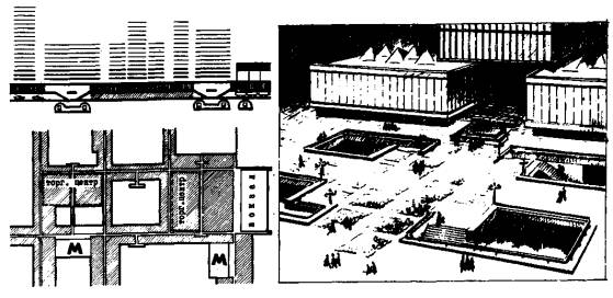 г. Париж, сад Тюильри (фрагмент проекта) Рис. 5. Приемы архитектурно-пространственной организации комплексов обслуживания в составе многоуровневых подземных общественно-транспортных узлов НА ВСЕЙ ПЛОЩАДИ ВЕРХНЕГО ПЕШЕХОДНОГО УРОВНЯ