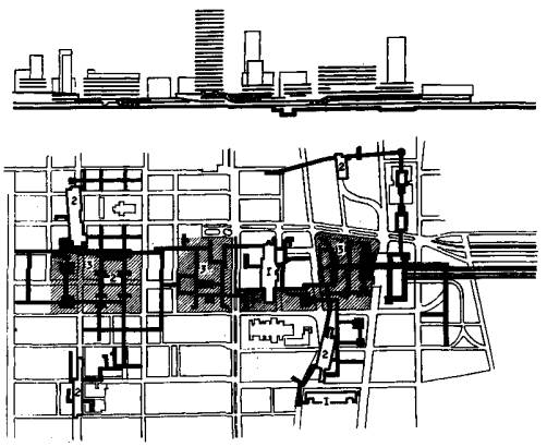 Рис. 9. приемы архитектурно-пространственой организации торгово-пешеходно-транспортных зон в составе общественного центра города на примере г. Филадельфия. ПЕРВЫЙ ПОДЗЕМНЫЙ УРОВЕНЬ