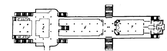 Рис. 7. Подземный торговый центр в Ереване 1 - универсам; 2 - кафе-бар; 3 - пандус; 4 - складские помещения; 5 - общественные туалеты; 6-7 - универмаг