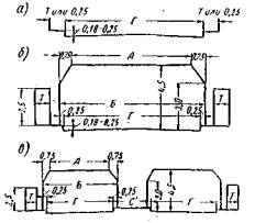 * Габарит Г-4,5 может быть применен только на дорогах с однополосным движением при ширине земляного полотна < 8 м. Устройство тротуаров обязательно на всех мостах дорог I и II категорий, на мостах дорог III категории при Г-7 и IV - V категорий при Г-6. На мостах дорог III категории при Г-8 и дорог IV - V категорий при Г-7 тротуары устраиваются только при наличии интенсивного пешеходного движения. При отсутствии тротуаров устраиваются защитные полосы по 0,25 м. Ширина тротуаров принимается равной 0,75 м; при интенсивном пешеходном движении с соответствующим обоснованием в каждом отдельном случае ширина их увеличивается на величину, кратную 0,75 м. На мостах с ездой понизу тротуары устраиваются, как правило, с внешней стороны ферм. Габариты городских мостов1 1 В настоящее время в связи с общим пересмотром указанных ТУ пересматриваются также и нормы габаритов мостов. По ТУ и нормам проектирования искусственных сооружений на городских путях сообщения 1948 г. установлены четыре группы габаритов: I группа - для пешеходного движения (см. рис. 102); II группа - для пешеходного и автомобильного движения (см. рис. 103); III группа - для пешеходного, автомобильного и трамвайного движения с пропуском стандартных трамвайных вагонов по колее нормальной ширины (1,524 м) (см. рис. 104); IIIа группа - то же, что и группа III, но с несимметричным расположением полос движения (см. рис. 105); IIIб группа - для пешеходного и трамвайного движения без автопроезда, а также при пропуске трамвайных путей под путепроводами (см. рис. 106); IV группа - то же, что и группа III, но с пропуском железнодорожного состава (данные по этой группе габаритов, как редко встречающихся, в книге не приводятся). Мосты I группы. Очертания габаритов для мостов с движением понизу, посередине и поверху приведены на рис. 102.
