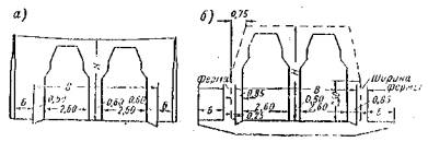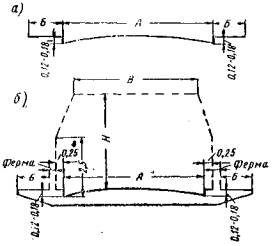 Ширина тротуара Б и высота H габарита назначаются так же, как и для мостов II группы. Мосты IIIа группы. Очертания габаритов для мостов с движением поверху показаны на рис. 105, а и с движением понизу - на рис. 105, б.