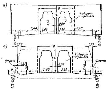 Ширина тротуара Б и высота H габарита назначаются так же как и для мостов II группы. Мосты III б группы. Очертания габаритов для мостов с движением поверху показаны па рис. 106, а и с движением понизу - на рис. 106, б.