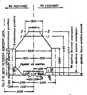 колеи: Принятые на рис. 108 высоты габаритов до линий: I - I - для строений из огнестойких и несгораемых материалов на не электрифицируемых участках; II - II - для строений, защищенных от возгорания, на не электрифицированных участках; III - III - для строений из сгораемых материалов; IV - IV - для строений из огнестойких, несгораемых и защищенных от возгорания материалов на электрифицируемых участках. Возвышение низа пролетных строений мостов