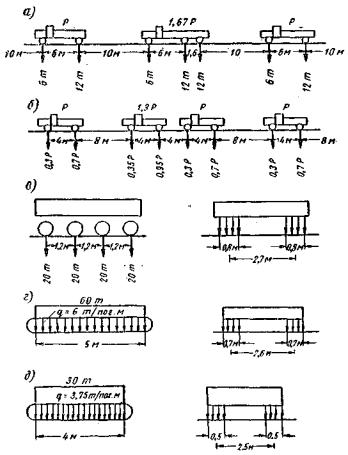Рис. 110. Схемы нагрузок: Основные показатели для автомобилей расчетных колонн по схемам Н-18, Н-13, Н-10 и Н-8 указаны в табл. 238. Основные показатели для расчетных машин по схемам НК-80, НГ-60 и НГ-30 указаны в табл. 240. Количество расчетных колонн автомобилей, устанавливаемых по ширине проезжен части, может быть любое, вызывающее максимальное усилие в его элементах или конструкциях при условии, что: расстояние между кузовами соседних машин должно быть не менее 0,1 м; габарит расчетного автомобиля не выступает за пределы проезжей части. Вдоль моста длина расчетной колонны не ограничивается; направление движения всех расчетных колонн принимается в одну сторону. Подвижная колесная нагрузка НК-80 или гусеничные НГ-60 и НГ-30 принимаются каждая состоящей из одной расчетной машины, установленной в расчетном положении на проезжей части параллельно оси сооружения. Величина подвижной автомобильной нагрузки при расчете конструкций искусственных сооружений, для которых расчетным загружением является одновременное загружение тремя и более колоннами автомобилей, умножается на коэффициент: а) при загружении тремя колоннами - 0,85; б) при загружении четырьмя и более колоннами - 0,75. Нагрузка от толпы на дорогах всех категорий принимается в виде равномерно распределённой нагрузки интенсивностью 300 кг/м2, расположенной только на тротуарах. Нагрузка толпой учитывается одновременно с автомобильной нагрузкой. В мостах, на которых тротуары отсутствуют, нагрузка не учитывается. При расчете пешеходных мостов нагрузка от толпы принимается интенсивностью в 400 кг/м2. Настил тротуара, кроме расчета на нагрузку от толпы, проверяется на сосредоточенный груз в 130 кг. При определении усилий по линиям влияния обычно пользуются эквивалентными нагрузками. Ниже приведены эквивалентные нагрузки в тоннах на 1 пог. м с соответствующими пояснениями. Подвижная вертикальная нагрузка для городских мостов Для расчета городских мостов применяются следующие подвижные вертикальные нагрузки: автомобильная, трамвайная, троллейбусная, колесная, гусеничная и толпа. По особым заданиям учитываются: электровоз промышленного типа, железнодорожная нагрузка (поезда), железнодорожная вагонная нагрузка. Автомобильная колесная и гусеничная нагрузки принимаются по нормам для расчета автодорожных мостов (Н-106-53). Городские мосты, рассчитанные на автомобильные нагрузки Н-10 и Н-13, особой проверки на пропуск троллейбусов не требуют. Нормативная трамвайная нагрузка1. Техническими условиями МКХ РСФСР 1948 г. предусматриваются два класса трамвайной нагрузки - Т-13 и Т-11 (числа 13 и 11 обозначают давление в тоннах на ось нормативного моторного вагона). 1 В настоящее время в связи с пересмотром ТУ МКХ 1948 г. пересматривается также и вопрос о трамвайных нагрузках. Фактические трамвайные нагрузки, находящиеся в обращении, наиболее ближе соответствуют нормальной нагрузке Т-11, тогда как Т-13 является выше их. Мосты, рассчитываемые под нагрузку Н-13 и выше, не потребуют проверки на трамвайную нагрузку Т-11, а нагрузка Т-13, которая в некоторых случаях может давать большие расчетные усилия, является нереальной нагрузкой. Вследствие этого предполагается внести существенные изменения в правила применения трамвайных нагрузок для расчета городских мостов. Схема трамвайных поездов в плане приведена на рис. 111.