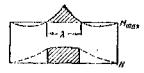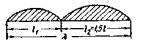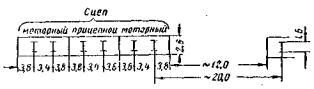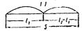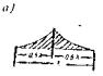 Рис. 111. Схема трамвайных поездов в плане Данные, характеризующие трамвайные нагрузки Т-13 и Т-11, приведены в табл. 254. При расчете металлических, железобетонных и каменных мостов применяется нагрузка Т-13. Нагрузка Т-11 применяется при расчете деревянных мостов. При загружении моста расчетной трамвайной нагрузкой учитываются следующие положения. Расчетный поезд состоит из неограниченного числа отдельных сцепов, расположенных друг за другом на расстоянии 20 м (между задней осью одного сцепа и передней осью последующего сцепа). Каждый сцеп состоит из двух моторных вагонов, расположенных по концам, и прицепного вагона посередине. Поезд трамваев вдоль моста может занимать любое положение, при этом: а) расположение поезда на мосту в поперечном направлении определяется положением рельсов; возможность схода трамвая с рельсов на мосту не учитывается; б) поезд может быть расположен с разрывами соответственно невыгоднейшему расчетному положению; кроме разрывов между отдельными сцепами, допускается разрыв каждого сцепа на две части с отделением первого или следующего моторного вагона; выкидка вагонов при разрывах не допускается и расстояние между поездами сохраняется не менее 20 м; в) при двухпутном движении трамваи могут быть расположены на обоих путях одновременно; г) при загружении полотна моста трамваями и автомобилями (т.е. тремя и более полосами подвижной нагрузки) снижение расчетной величины нагрузок производится аналогично указанному выше для автомобильной нагрузки; при этом между габаритами автомобилей и трамваев принимается зазор не менее 0,3 м. В таблицах 256 и 258 приводятся эквивалентные нагрузки в тоннах на 1 пог. м от поездов трамвайных вагонов для различных очертаний линий влияния. В городских мостах (по ТУ МКХ 1948 г.) нагрузка толпой принимается: 1) интенсивностью 500 кг/м2 - для расчета элементов тротуара, а также для расчета проезжей части и главных ферм пешеходных мостов; 2) интенсивностью 400 кг/м2 - для расчета главных ферм мостов под автомобильное, трамвайное и другое движение; 3) горизонтальное давление толпы на поручни перил принимается равным 100 кг/пог. м. Сосредоточенный груз для расчета элементов тротуара - 150 кг. Динамические коэффициенты При расчете металлических и железобетонных пролетных строений, опорных частей, металлических и железобетонных рамных и свайных опор нагрузку от автомобилей вводят с динамическим коэффициентом. Величина динамического коэффициента для металлических мостов принимается по формулам: для балочных и арочных мостов комбинированных систем и проезжей части всех мостов и металлических опор