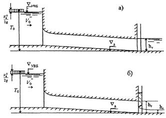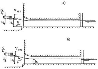 Рис. 7.2 7.9. Формула (7.1) может использоваться при частичном открытии затворов (рис. 7.1, б), установленных в конце напорного участка туннеля. В качестве расчетной должна быть принята площадь сжатого сечения при истечении из-под затвора или какая-либо другая, но это обстоятельство должно быть учтено при определении коэффициента расхода. В этом случае необходимо принимать П = hc. 7.10. Коэффициенты расхода напорного туннеля при пропуске расходов и фиксированном открытии затворов, установленных в его выходном сечении, остаются постоянными, если не внесено запланированных изменений в его конструкцию. Если же в процессе эксплуатации коэффициент расхода напорного туннеля становится отличным от первоначального значения, то это является признаком происшедших изменений условий его эксплуатации. 7.11. Для безнапорных туннелей, входной оголовок которых работает как водослив, соответствие между расходом и напором устанавливается по следующим зависимостям (рис. 7.2): при неподтопленном истечении