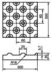 4.2.3 Наземные пешеходные переходы для инвалидов по зрению представляют собой искусственные неровности монолитной конструкции и должны соответствовать требованиям ГОСТ Р 52605 с учетом требования 4.2.4. 4.2.4 Обустройство наземных пешеходных переходов для инвалидов по зрению должно соответствовать требованиям ГОСТ Р 52289. 4.2.5 Покрытие наземного пешеходного перехода для инвалидов по зрению должно быть отличным от покрытия тротуара и проезжей части дороги. 4.2.6 Для тактильных дорожных указателей, установленных на тротуарах, рекомендуется применять бетонные тротуарные плиты размерами 300 4.2.7 Дорожные указатели из тротуарных плит, установленные на тротуаре, должны выступать над его поверхностью не более чем на 4.2.8 В качестве указателя на территории предприятий, жилых районов и микрорайонов можно применять дорожки с гравийным покрытием. В местах пересечения двух дорожек рекомендуется устраивать площадки, возвышающиеся на 4.2.9 Перед входными дверями зданий и сооружений на расстоянии 4.3 Требования к тактильным напольным указателям4.3.1 Тактильные напольные указатели располагают в коридорах и на площадках лестничных маршей общественных зданий и сооружений для обозначения инвалидам по зрению направления движения, а также для предупреждения их о возможных опасностях на пути следования. Глубина рифов для тактильных напольных указателей с формой рифления, указанной на рисунках 1-4, должна быть 4.3.2 Назначение, размеры, форма рифления и место расположения тактильных напольных указателей приведены в таблице 2. Таблица 2