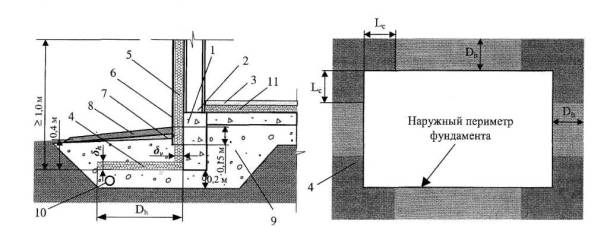 Рис. 1. Схема укладки и параметры теплоизоляции ПЕНОПЛЭКС® в фундаментах отапливаемых зданий с теплоизоляцией пола 1 - фундамент; 2 - стена здания; 3 - пол здания; 4 - горизонтальная теплоизоляция ПЕНОПЛЭКС®; 5 - вертикальная теплоизоляция ПЕНОПЛЭКС®; 6 - защитное покрытие; 7 - песчаная подготовка под отмостку; 8 - асфальтовая или бетонная отмостка; 9 - непучинистый грунт; 10 - дренаж; 11 - теплоизоляция пола