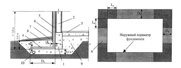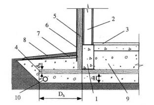 Рис. 1 а. Схема укладки и параметры теплоизоляции ПЕНОПЛЗКС® в фундаментах отапливаемых зданий без теплоизоляции пола 1 - фундамент; 2 - стена здания; 3 - пол здания; 4 - горизонтальная теплоизоляция ПЕНОПЛЭКС®; 5 - вертикальная теплоизоляция ПЕНОПЛЭКС®; 6 - защитное покрытие; 7 - песчаная подготовка под отмостку; 8 - асфальтовая или бетонная отмостка; 9 - непучинистый грунт; 10 - дренаж 5.8 В неотапливаемых зданиях ПЕНОПЛЭКС® укладывается только горизонтально под подошвой фундамента в пределах всего здания и изоляционной юбки, которая выступает за контур здания на ширину Dh. Толщина слоя ПЕНОПЛЭКС® принимается постоянной и равной δh (рис. 2, 3 и 3 а).