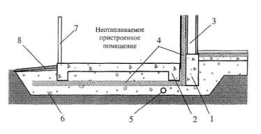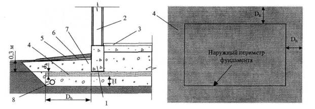 Рис. 2. Схема укладки и параметры теплоизоляции ПЕНОПЛЭКС® в фундаментах неотапливаемых зданий 1 - фундамент; 2 - стена здания; 3 - пол здания; 4 - горизонтальная теплоизоляция ПЕНОПЛЭКС®; 5 - асфальтовая или бетонная отмостка; 6 - песчаная подготовка под отмостку; 7 - непучинистый грунт; 8 - дренаж