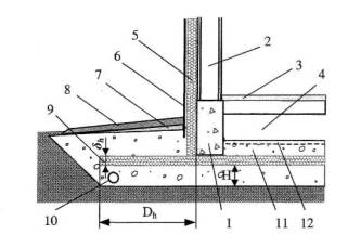 Рис. 3 а. Схема укладки и параметры теплоизоляции ПЕНОПЛЭКС® в фундаментах зданий с невентилируемым подпольем и переменным режимом эксплуатации (отапливаемое - неотапливаемое) 1 - фундамент; 2 - стена здания; 3 - пол здания; 4 - невентилируемое подполье; 5 - вертикальная теплоизоляция ПЕНОПЛЭКС®; 6 - защитный слой; 7 - песчаная подготовка под отмостку; 8 - асфальтовая или бетонная отмостка; 9 - горизонтальная теплоизоляция ПЕНОПЛЭКС®; 10 - дренаж; 11 - непучинистый грунт; 12 - парозащитный слой 5.9 Под отдельно стоящей или ленточной опорой ПЕНОПЛЭКС® укладывается горизонтально непосредственно под подошвой фундамента, выступая за его контуры на ширину Dh, и имеет толщину δh (рис. 4 и 4 а).