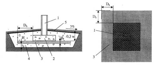 Рис. 4. Схема укладки и параметры теплоизоляции ПЕНОПЛЭКС® в фундаментах отдельно стоящих опор 1 - опора; 2 - фундамент; 3 - теплоизоляционный слой ПЕНОПЛЭКС®; 4 - песчано-гравийная смесь; 5 - водоупорный слой