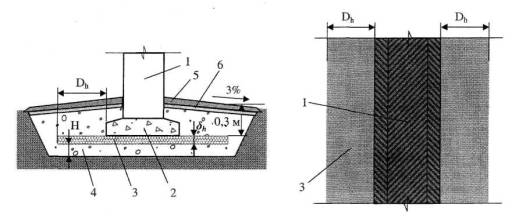 Рис. 4 а. Схема укладки и параметры теплоизоляции ПЕНОПЛЭКС® при устройстве ленточной опоры 1 - ленточная опора; 2 - фундамент; 3 - теплоизоляционный слой ПЕНОПЛЭКС®; 4 - песчано-гравийная смесь; 5 - отмостка; 6 - песчаная подготовка под отмостку 5.10 Если у отапливаемых зданий имеются холодные пристройки, например, террасы, крыльца, то теплоизоляционной юбке придается форма, показанная на рис. 5, а ширина юбки увеличивается на ширину пристройки. При этом ее параметры Dh и δh принимаются как для неотапливаемого здания.