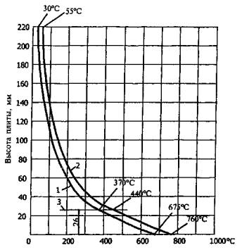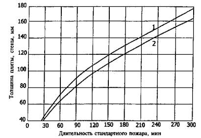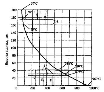 Рис. А.5. Температура прогрева тяжелого бетона на силикатном заполнителе в плитах на профилированном настиле (1) при одностороннем огневом воздействии длительностью 60 и 100 мин