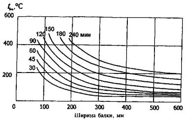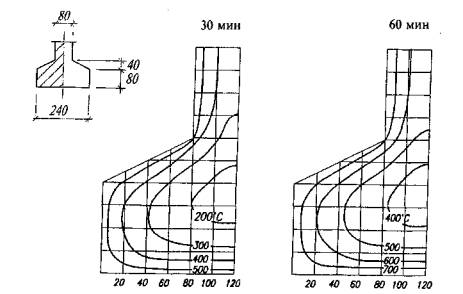 Рис. Б.3. Температура прогрева бетона в двутавровых балках с шириной полок 240 мм и стенкой 80 мм при трехстороннем огневом воздействии длительностью 30 и 60 мин