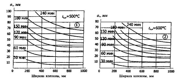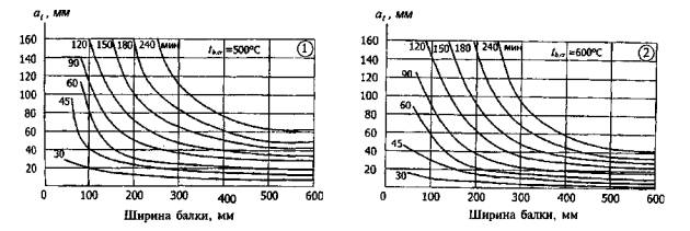 Рис. 5.2. Глубина прогрева at до критической температуры tb,cr в балке от нагреваемой грани сечения 1 - тяжелый бетон на силикатном заполнителе; 2 - то же, на карбонатном; 30-240 - время прогрева в минутах от стандартного пожара 4. Определяют прочность сечения железобетонного элемента от действия нормативной нагрузки при требуемом пределе огнестойкости. Если вычисленная прочность больше или равна прочности сечения от нормативной нагрузки до пожара, то требуемый предел огнестойкости обеспечен или для требуемого предела огнестойкости R определяют расчетом необходимую площадь растянутой и сжатой арматуры.