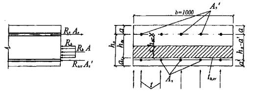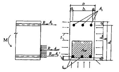 Рис. 5.4. Схема усилий и эпюра напряжений в сечении, нормальном к продольной оси железобетонной балочной плиты в пролете, обогреваемой при пожаре с нижней стороны Во многих случаях можно пренебречь прогревом бетона сжатой зоны и сжатой арматуры, так как они нагреваются незначительно. Высота сжатой зоны определяется по формуле x = (RsntAs - RscA's)/ Rbnb. (5.9) Прочность сечения проверяют по формуле М = Rbn bx (h0 - 0,5х) + Rsc A's(h0 - a'). (5.10) Если температура сжатой зоны бетона и сжатой арматуры высокая, то в формулы (5.9) и (5.10) вводят нормативное сопротивление бетона сжатию Rbnt, вычисленное по формуле (2.1), и сопротивление сжатию арматуры Rsct, определенное по формуле (2.8). В сильноармированных плитах при ξ < ξR допускается их прочность определять по формуле: М = Rsnt As(h0 - 0,5x) + Rsct A's(0,5x - a'). (5.11) Высоту сжатой зоны определяют по формуле (5.9). Если значения моментов, вычисленные по формулам (5.10) и (5.11), равны или больше нормативного момента до пожара, то принятая в проекте конструкция плиты обеспечивает требуемый предел огнестойкости R. 5.5. Для того чтобы установить предел огнестойкости плиты R, можно найти критическое значение коэффициента условия работы растянутой арматуры. Критическое значение коэффициента условий работы растянутой арматуры, когда ξ < ξR вычисляют по формулам: при одиночном армировании γst,cr = Mn/Rsn As(h0 - 0,5x), (5.12) при двойном армировании γst,cr = [Mn - Rsct A's(0,5x - a')]/Rsn As (h0 - 0,5x), (5.13) где Мп - момент от нормативной нагрузки. Высоту сжатой зоны определяют по формуле (5.9). Зная критическое значение коэффициента условий работы арматуры γst,cr, в зависимости от класса арматуры по табл. 2.8 определяют критическую температуру нагрева арматуры ts,cr, при которой наступает предел огнестойкости R по потере несущей способности. Время наступления предела огнестойкости находят по кривым прогрева бетона плит (приложение А), принимая критическую температуру нагрева арматуры ts,cr равной температуре бетона на уровне ее оси. Многопустотные плиты5.6. В многопустотных плитах предел огнестойкости может наступить при действии изгибающего момента от нормативной равномерно распределенной нагрузки в пролете и в опасном наклонном сечении от момента и проскальзывания арматуры на опоре при нагреве контактного слоя бетона и арматуры до критической температуры. Расчет огнестойкости при действии изгибающего момента в опасном наклонном сечении и момента, воспринимаемого продольной арматурой, пересекающей растянутую зону наклонного сечения, определяют из условия (5.14). Расчет огнестойкости при действии изгибающего момента в пролете производят по формулам (5.10) и (5.11) и в опасном наклонном сечении из условия М = 0,9Nsh0 + 0,5Rswt Aswc2/sw. (5.14) Усилие Ns в формуле (5.14), воспринимаемое анкерующим стержнем арматуры при ds ≤ 32 мм в зоне анкеровки, определяют по формуле Ns = (η1Rbtnt ls us /α) < Rsnt As. (5.15) Rswt - сопротивление в поперечной арматуре, определяют по формуле (2.9), в которой γst принимают по табл. 2.8 для максимальной температуры нагрева хомутов; Asw - площадь поперечной арматуры на единицу длины плиты; с - длина проекции наклонной трещины, принимаемая от h0 до 2h0; sw - расстояние между хомутами; Rsnt - нормативное сопротивление растяжению, которое определяют по формуле (2.7), принимая γst, по табл. 2.8 для температуры анкерующего стержня; η1 - коэффициент, учитывающий влияние вида поверхности арматуры, принимаемый равным: 1,5 - для арматуры класса А