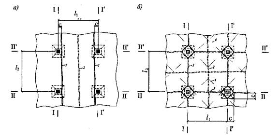 Рис. 5.6. Схема излома средней полосы (а) и излома смежных панелей (б) безбалочного перекрытия 1 - отрицательные шарниры; 2 - положительные шарниры; 3 - сквозные трещины; 4 - оси надопорных шарниров Расчет на излом отдельной поперечной или продольной полосы панели производят в предположении, что в рассматриваемой полосе панелей образуются линейные пластические шарниры, параллельные оси этой полосы: один линейный пластический шарнир в пролете с раскрытием трещины снизу плиты и по одному линейному пластическому шарниру у колонн с раскрытием трещин сверху плиты. В консольном свесе плиты, выступающем за крайний ряд колонн, принимается, что пластический шарнир не образуется, если свес консоли не превышает 0,25lх. Если свес консоли больше, то производят дополнительный расчет по формуле (5.16) на излом плиты консоли у колонн с образованием дополнительного пластического шарнира, параллельного краю перекрытия. Для конструкций, симметричных относительно середины рассматриваемой полосы, проверку прочности средних панелей ведут из условия: где q - интенсивность нормативной постоянной и кратковременной длительных нагрузок с коэффициентом перегрузки γf = 1, равномерно распределенных по полосе на 1 м2; l1, l2 - расстояние между рядами колонн в направлении, перпендикулярном полосе, и вдоль рассматриваемой полосы (рис. 5.6); с - расстояние крайних пластических шарниров до ближайших к ним рядов колонн; AsI, A'sI - площадь верхней растянутой арматуры в левом и правом опорных пластических шарнирах в пределах одной панели; As1 - площадь нижней растянутой арматуры в среднем пластическом шарнире; zI, z1, z'I - плечи внутренней пары сил в левом, среднем и правом пластических шарнирах соответственно, которые определяют по формуле: Высоту сжатой зоны в левом и правом опорных пластических шарнирах определяют по формулам: В формуле (5.18) Rbnt определяют по формуле (2.1), принимая значения γbt по табл. 2.2 в зависимости от средней температуры бетона сжатой зоны. Допускается γbt принимать равным 1 при замене h0 на h0t, которое определяют по формуле (5.8). Высота сжатой зоны в среднем пролетном пластическом шарнире равна: В формуле (5.19) Rsnt определяют по формуле (2.7), принимая значения γst по табл. 2.8 в зависимости от температуры арматуры на уровне ее оси. Температуру бетона и арматуры определяют теплотехническим расчетом для требуемого предела огнестойкости (приложения А и Б). Если условие (5.16) выполняется, то требуемый предел огнестойкости обеспечен. Сжатую арматуру в пластических шарнирах не учитывают. При