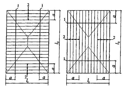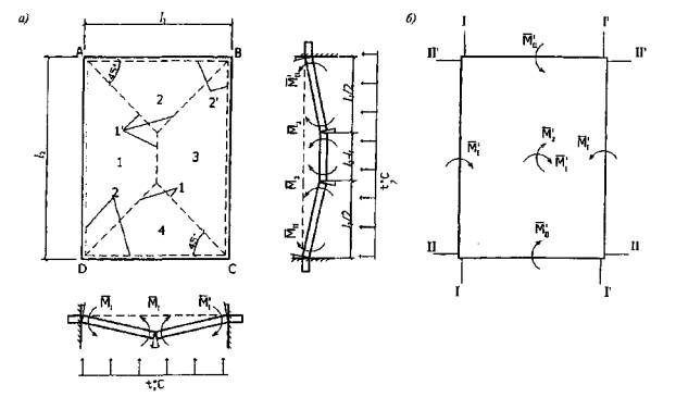 Рис. 5.7. К расчету плиты, защемленной по контуру a - схема излома плиты; б - направления действия предельных моментов; 1-4 - номера звеньев; 1', 2' - шарниры соответственно пролетные и опорные где As1 - площадь сечения стержней, пересекающих пролетные пластические шарниры и параллельных короткой стороне плиты; As2 - то же, для стержней, параллельных длинной стороне плиты; AsI - площадь сечения растянутой арматуры, расположенной вдоль пролета l2, в сечении I-I; A'sI - площадь сечения растянутой арматуры, расположенной вдоль пролета l2, в сечении I'-I'; AsII - площадь сечения растянутой арматуры, расположенной вдоль пролета l1 в сечении II-II; A'sII = площадь сечения растянутой арматуры, расположенной вдоль пролета l1 в сечении II'-II'; z1, z2 - плечи внутренней пары сил в пролетных пластических шарнирах, вычисляются по формуле (5.17), в которой х1 определяют по формуле (5.19), а при вычислении х2 в формуле (5.19) значение As1 заменяют на As2, а вместо значения l2 подставляют l1; zI, z'I, zII, z'II - плечи внутренней пары сил в опорных пластических шарнирах, вычисляются по формуле (5.17), в которой хI и х'I определяют по формуле (5.18). При вычислении хII и х'II в формуле (5.18) значения AsI и A'sI заменяют соответственно на AsII и A'sII, а вместо значения l2 подставляют l1. При определении значений As1 и As2 стержни, отогнутые или оборванные до пересечения с пролетными шарнирами, не учитывают (рис. 5.8), а оборванные или отогнутые только у одной из опор и пересекающие пролетные шарниры одним из концов вводят в расчет с половинной площадью.