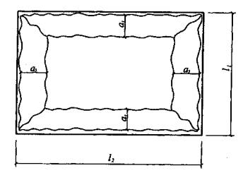 Рис. 5.9. Возможная схема излома плиты при обрыве или отгибе арматуры Если арматуру обрывают (отгибают) на расстоянии а1 от длинной и а2 от короткой сторон, то необходимо дополнительно выполнить проверку по несущей способности плиты при изломе по схеме, показанной на рис. 5.9. Эту проверку производят из условия: где Если условия (5.20) или (5.23) соблюдаются, то требуемый предел огнестойкости плиты обеспечен. ПРИМЕРЫ РАСЧЕТА Пример 1. Дано. Балочная плита перекрытия в магазине; высота плиты h = 160 мм, ширина b = 1200 мм, длина l = 5500 мм; бетон тяжелый класса В25; Rbn = 18,5 МПа; арматура класса А400 Ø16; Rsn = 400 МПа; защитный слой бетона 15 мм; нормативная постоянная и временная длительнодействующая нагрузка 6500 Па. Для трехэтажного магазина с площадью между противопожарными стенами 2500 м2 по табл. 3 СНиП 2.08.02 находим I и II степени огнестойкости здания. Как наиболее безопасную принимаем I степень огнестойкости. По табл. 1.1 для I степени огнестойкости здания устанавливаем для плит междуэтажных перекрытий пределы огнестойкости REI 60. Требуется определить пределы огнестойкости железобетонной плиты перекрытия. Расчет. Поскольку вид заполнителя не указан, то принимаем бетон с большей теплопроводностью - бетон с силикатным заполнителем. Расчетный пролет плиты при опирании на кирпичную стену глубиной ls = 0,13 м равен l0 = l - 4/3 ls = 5,5 - 4/3·0,13 = 5,33 м. Момент в пролете плиты при нагрузке на 1 м длины q = 6500·1,2 = 7800 Па = 7,8 кН/м;