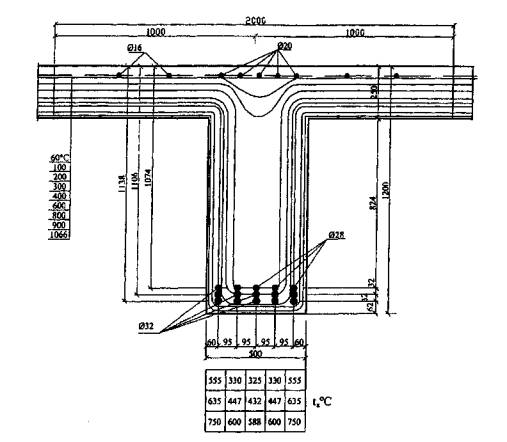 Рис. 5.14. К примеру 7. Сечение в пролете балки перекрытия туннеля пролетом 20 м при длительности стандартного пожара 180 мин Расчет. По рис. Б.2 приложения Б находим температуру прогрева бетона в балке и плите, интерполируя температуры бетона по ширине балки до 500 мм и по высоте до 1200 мм и экстраполируя температуры бетона плиты высотой 200 мм до 250 мм (рис. 5.14). При огневом воздействии арматура прогревается до 750 °С. Для каждого стержня арматуры по табл. 2.8 находим коэффициент условия работы арматуры γst в зависимости от температуры стержня при: ts = 330 °С 3Ø28 As = 1847 мм2 γst = 0,96; ts = 555 °С 2Ø28 As = 1232 мм2 γst = 0,49; ts = 447 °С 3Ø32 As = 2413 мм2 γst = 0,73; ts = 635 °С 2Ø32 As = 1609 мм2 γst = 0,33; ts = 600 °С 3Ø32 As = 2413 мм2 γst = 0,37; ts = 750°С 2Ø32 As = 1609 мм2 γst = 0,16. Рабочая высота: h01 = 1200 - 62 = 1138 мм; h02 = 1200 - 94 = 1106 мм; h03 = 1200 - 126 = 1074 мм; h'0 = 1200 - 45 - 53 = 1102 мм. Критические значения температуры нагрева бетона на силикатном заполнителе (п. 1.21) - tb,cr = 500 °С. Глубину прогрева бетона до критической температуры находим по рис. А2 и 5.2. Для плиты и балки глубина прогрева бетона до 500 °С при длительности пожара 180 мин составляет 53 мм. Приведенная ширина балки определяется по формуле (5.1) bt = 500 - 2·53 = 394 мм и приведенная высота плиты - по формуле (5.3) h'ft = 250 - 53 = 197 мм. Свесы полки в расчете должны быть не более 1/6l = 1/6·20000 = 3333 мм и не более 0,5·2000 = 1000 мм. Ширина полки bft = 500 + 2·1000 = 2500 мм. Проверяем условия (5.24). Левая часть условия равна (при МПа = Н/мм2) ΣRsntАs = 400·0,96·1847 + 400·0,49·1232 + 400·0,73·2413 + 400·0,33·1609 + + 400·0,37·2413 + 400·0,16·1609 = 23,27·105 Н Rsnt = 355 МПа; A's = 1571 мм2. Правая часть условия равна 22·2500·197 + 355·1571 = 114·105 Н > 23,27·105 Н. Сжатая зона проходит в полке. Высота сжатой зоны по формуле (5.9) равна