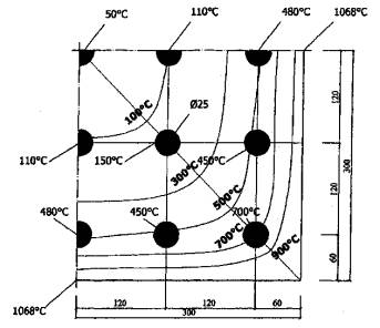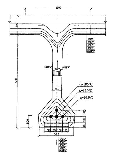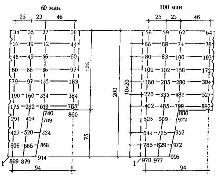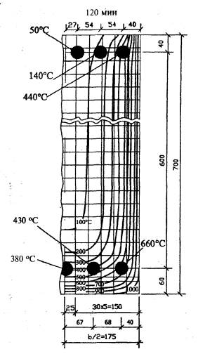 Рис. 5.15. К примеру 8. Температуры в двутавровой балке с толщиной стенки 16 см при длительности стандартного пожара 180 мин Требуется определить возможность применения балок этой серии в перекрытиях тоннелей, относящихся к 1-му ответственному уровню надежности, для которой устанавливается предел огнестойкости по потере несущей способности R180. Расчет. Теплотехническим расчетом или по приложению Б (рис. 63) МДС 21-2.2000 находим температуру прогрева бетона в двутавровой балке. При этом интерполируя температуру по ширине полки с 400 мм до 580 мм и по высоте балки с 760 мм до 1500 мм. Основная предварительно напряженная арматура состоит из четырех пучков канатов К7-1400, которые расположены на расстоянии 180 и 280 мм от нижней нагреваемой грани балки. Арматурные пучки прогреваются до 130, 185 и 195 °С. При этих температурах нагрева пучков коэффициент условия работы арматуры γst = 1,0 и прочность арматурных канатов не изменяется во время пожара. Однако предварительное напряжение в канатах снижается. Согласно формуле (5.92) предварительного напряжения в канатах останется при температуре нагрева до 130 °С σsp = 89 - 0,27·130 = 54 %; при 185 °С - σsp = 39 %; при 195 °С - σsp = 36 %. В стенке толщиной мм, при двухстороннем нагреве бетон прогреется до 820 - 1088 °С. При таких высоких температурах бетон разрушится, стенка не будет работать и перекрытие тоннеля обрушится во время пожара. Этого допустить нельзя. Кроме того, к несущим конструкциям, относящимся к 1-му уровню надежности, предъявляются требования по огнесохранности (п. 1.23). Для обеспечения требуемых огнестойкости и огнесохранности на балку необходимо нанести огнезащитное покрытие, которое позволило бы снизить температуру нагрева наружной поверхности бетона до 450-500 °С. Легкое огнезащитное покрытие может состоять из вспученных перлита и вермикулита или из керамзитового песка на основе вяжущего портландцемента. Портландцемент (ГОСТ 10178), вспученный перлит насыпной массой не более 300 кг/м3 из смеси пудры и фракция до 5 мм; вспученный вермикулит (ГОСТ 12869) насыпной массой не более 200 кг/м3 при крупности зерен до 5 мм. Керамзит (ГОСТ 9759) без содержания свободной окиси кальция СаО, окиси магния, а также карбонатных включений. Объемная масса керамзитового песка 350-500 кг/м3. Ориентировочные составы огнезащитного покрытия на 1 м3: портландцемент - 300 кг, перлит - 500 кг; портландцемент - 350 кг, вермикулит - 600 кг; портландцемент - 300 кг, керамзит - 400 кг. Для уменьшения температурно-усадочных деформаций и компенсации температурных напряжений, возникающих между бетоном и огнезащитным покрытием, целесообразно вводить распушенный асбест V-VI сортов, полужестких марок П-5-65, П-5-70 в количестве 10-20 % массы сухой смеси. Для улучшения технологичности смеси рекомендуется укладывать смесь глиняной суспензии (шликера) плотностью 1,1-0,2 г/м3 или вводить в состав смеси 20 % массы заполнителя молотой глины. Прогрев огнезащитного покрытия толщиной 25 мм при стандартном пожаре длительностью R180 (3 ч) устанавливают расчетом. Покрытие с перлитовым заполнителем. Влажность покрытия W = 15 %. Плотность смеси в сухом состоянии