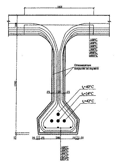 Температура прогрева каждого слоя tbi = 20 + 1200 (1 - r1i)2, где r1i = x'i/h ≤ 1. При толщине огнезащитного покрытия 25 мм температура наружного слоя бетона будет 414 °С. Температура бетона в центре стенки двутавровой балки - 83 °С и температура арматурных пучков - 34, 40 и 42 °С (рис. 5.16). При этих температурах нагрева предварительно напряженных канатов в пучках дополнительные потери предварительного напряжения будут незначительные и железобетонная двутавровая балка обеспечит требуемый предел огнестойкости по потере несущей способности R180 и огнесохранность после пожара.