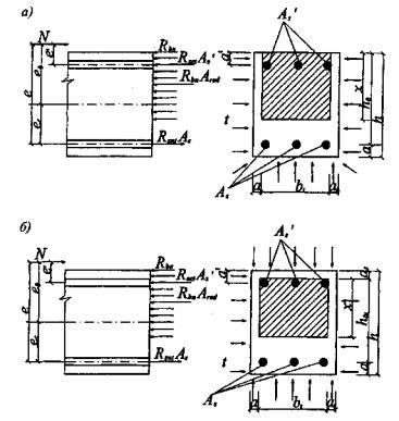 м. При действии продольной силы, приложенной со случайным эксцентриситетом е0 = h/30 и при е0 < 20ht расчет производится из условия (5.29), в котором