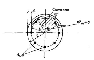 Рис. 5.18. Схема усилий в поперечном двутавровом сечении внецентренно сжатого элемента при четырехстороннем огневом воздействии Если условие (5.44) не соблюдается (т.е. граница сжатой зоны проходит в ребре), прочность сечения проверяют из условия Ne ≤ Rbnbtx(h0t - 0,5х) + RbnAov(h0t - 0,5h'ft) + RsctA's(h0t - a'), (5.45) где высоту сжатой зоны х принимают равной: а) при б) при ξ > ξR где Aov - площадь сжатых свесов полки, равная Aov = (b'ft - bt)h'ft; (5.47) ξR - см. табл. 5.1. При переменной высоте свесов полок значение h'fi принимается равным средней высоте свесов. Колонны круглого сечения5.19. Огнестойкость по потере прочности круглых сечений (рис. 5.19) с арматурой, равномерно распределенной по окружности (при числе продольных стержней не менее 7), при классе арматуры не выше А400 проверяется из условия где r - радиус поперечного сечения, rt = r - at, at - см. п. 5.14; ξcir - относительная площадь сжатой зоны бетона, определяемая следующим образом: при выполнении условия N = 0,77RbnAred + 0,645RsntAs,tot (5.49)