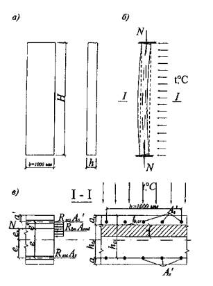 при невыполнении условия (5.49) из решения уравнения φ - коэффициент, учитывающий работу растянутой арматуры и принимаемый равным: при выполнении условия (5.49) φ = 1,6(1 - 1,55ξcir)ξcir, но не более 1,0; при невыполнении условия (5.49) φ = 0; As,tot - площадь сечения всей продольной арматуры; Ared - по формуле (5.30); rs - радиус окружности, проходящей через центр тяжести стержней продольной арматуры. Момент М определяется с учетом прогиба элемента. η - коэффициент, определяемый по формуле (5.36). Проверку предела огнестойкости по прочности, а также определение необходимого количества продольной арматуры для круглых сечений допускается производить с помощью графиков на рис. 5.20, используя формулы αп = N/Rbn·Ared, αs = Rsnt·As,tot/Rbn·Ared. (5.54) Прочность колонн, вычисленная по формулам (5.29), (5.31), (5.44), (5.45), (5.48) и (5.53) от нормативной нагрузки при стандартном пожаре длительностью, соответствующей пределу огнестойкости R, должна быть равна или больше прочности от нормативной нагрузки до пожара. Несущие стены5.20. Железобетонные несущие стены сплошного сечения с гибкостью λ ≤ 83(l0/ht ≤ 24) при одностороннем огневом воздействии с жесткими несмещаемыми опорами, когда продольная сжимающая сила приложена с начальным или случайным эксцентриситетом со стороны обогреваемой поверхности, работают на внецентренное сжатие. Предел огнестойкости по потере несущей способности наступает при прогибе стены, направленном в необогреваемую сторону. Прогиб от неравномерного нагрева стены по высоте сечения в расчете не учитывают, если он направлен в обогреваемую сторону и уменьшает эксцентриситет приложения продольной сжимающей силы. При одностороннем огневом воздействии и с жестким опиранием стены прочность внецентренно сжатых плоских элементов при приложении продольной силы с большим эксцентриситетом (рис. 5.21), когда ξ = x/h0t ≤ ξR, определяют по формулам (5.31) - (5.33). Расчетный предел огнестойкости железобетонных стен при контактном опирании на упруго-податливое основание при растворных швах толщиной 20 мм умножается на коэффициент упругой податливости 0,75; при швах толщиной 5 мм, заполненных цементно-песчаной пастой, - 0,85.