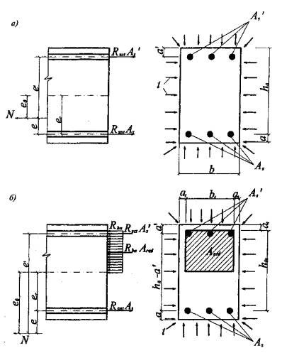 Рис. 5.17. Схема усилий и эпюра напряжений в сечении, нормальном к продольной оси внецентренно сжатого железобетонного элемента а - при трехстороннем обогреве и расчете на огнестойкость; б - то же, при четырехстороннем 5.17. Эксцентриситет или расстояние от точки приложения продольной силы N до центра тяжести сечения растянутой или менее сжатой арматуры в прямоугольном сечении колонны при огневом воздействии определяют по следующей формуле е = е0 η + 0,5 (h0 - а') + et; (5.34) Значение коэффициента, учитывающего влияние продольного изгиба элемента на его несущую способность, определяют по формуле Условную критическую силу определяют по формуле Ncr = π2 D/l20. (5.37) Жесткость железобетонного элемента в предельной по прочности стадии допускается определять по формулам: для любой формы сечения для элементов прямоугольного сечения с арматурой, расположенной у наиболее сжатой и у растянутой (менее сжатой) грани элемента I, Is - моменты инерции соответственно бетонного сечения и сечения всей арматуры относительно центра тяжести бетонного сечения элемента; Еbt - модуль упругости бетона, определяют по формуле (2.5), в которой βb принимают по средней температуре бетона всего сечения; Est - модуль упругости арматуры, определяют по формуле (2.10), в которой βs принимают по температуре всей арматуры; φ1 - коэффициент, учитывающий влияние длительного действия нагрузки на прогиб элемента и равный М1, Ml1 - моменты внешних сил относительно оси, нормальной к плоскости изгиба и проходящей через центр наиболее растянутого или наименее сжатого (при целиком сжатом сечении) стержня арматуры, соответственно от действия всех нагрузок и от действия постоянных и длительных нагрузок. При расчете огнестойкости φ1 = 2; δе = e0/ht, но не менее 0,15. (5.41) Для кольцевых и круглых сечений значение ht заменяется на Dcir,t.